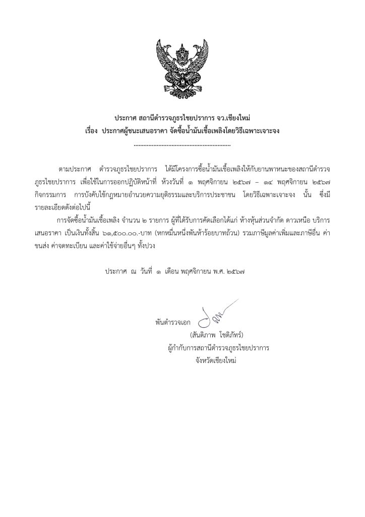ประกาศต่าง ๆ เกี่ยวกับการจัดซื้อจัดจ้าง ประกาศผู้ชนะเสนอราคา การจัดซื้อน้ำมันเชื้อเพลิงโดยวิธีเฉพาะเจาะจง 17 ม.ค.68