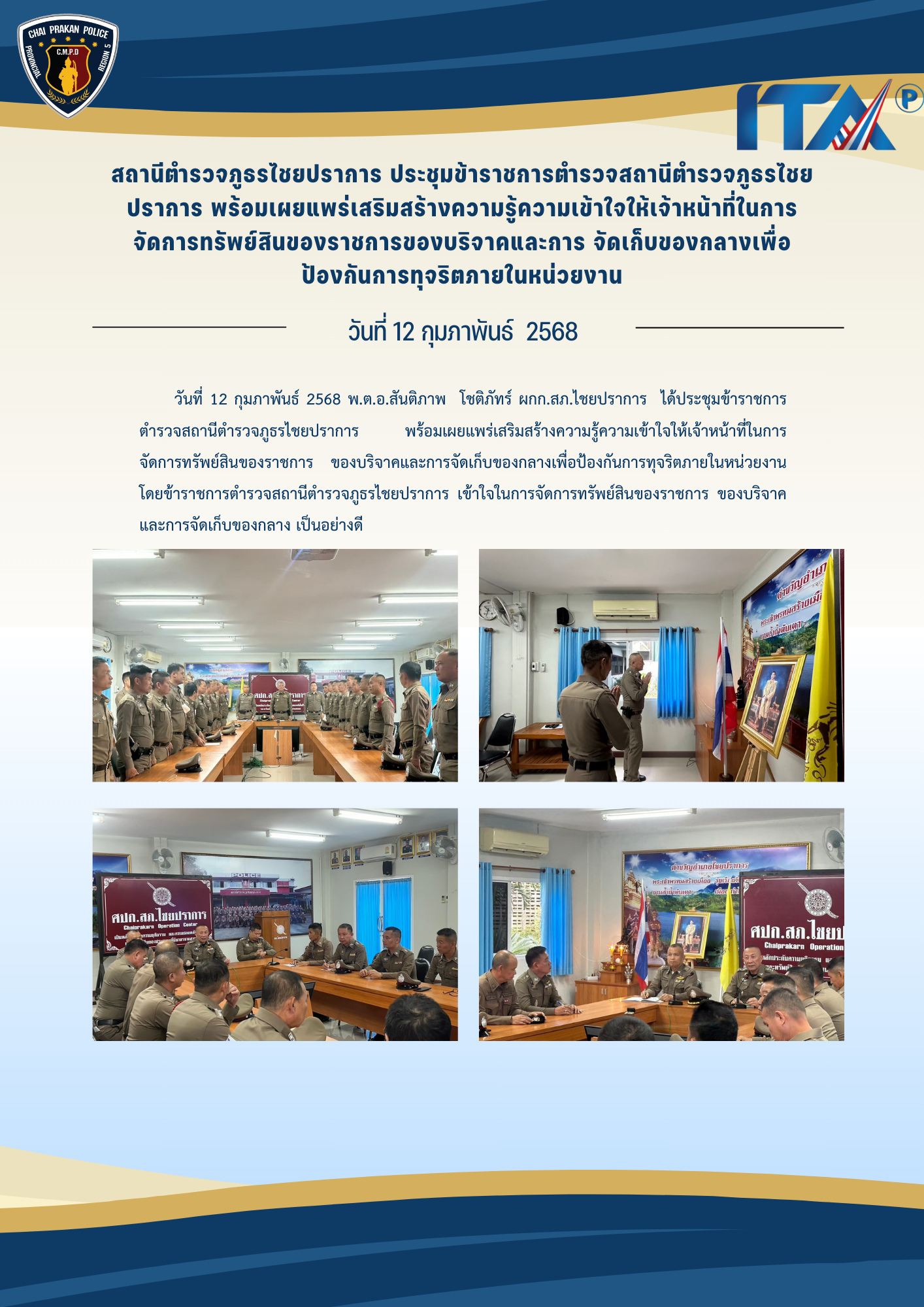 ITA ประชาสัมพันธ์ admin 12 กุมภาพันธ์ 2025 0 Comments ประชุมข้าราชการตำรวจเผยแพร่เสริมสร้างความรู้ความเข้าใจให้เจ้าหน้าที่ในการจัดการทรัพย์สินของราชการของบริจาคและการ จัดเก็บของกลางเพื่อป้องกันการทุจริตภายในหน่วยงาน FacebookFacebookXXLINELine