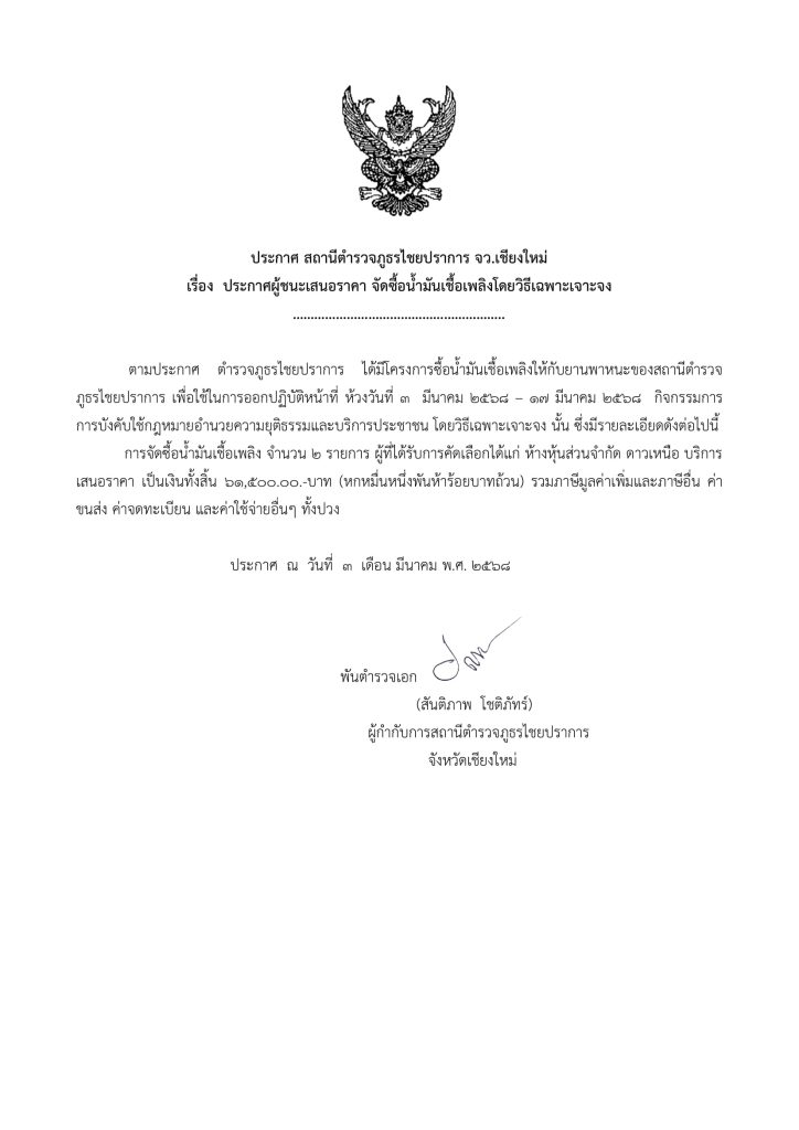 ประกาศต่าง ๆ เกี่ยวกับการจัดซื้อจัดจ้าง ประกาศผู้ชนะเสนอราคา การจัดซื้อน้ำมันเชื้อเพลิงโดยวิธีเฉพาะเจาะจง 3 ก.พ.68