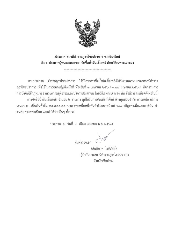 ประกาศต่าง ๆ เกี่ยวกับการจัดซื้อจัดจ้าง ประกาศผู้ชนะเสนอราคา การจัดซื้อน้ำมันเชื้อเพลิงโดยวิธีเฉพาะเจาะจง 17 ม.ค.68